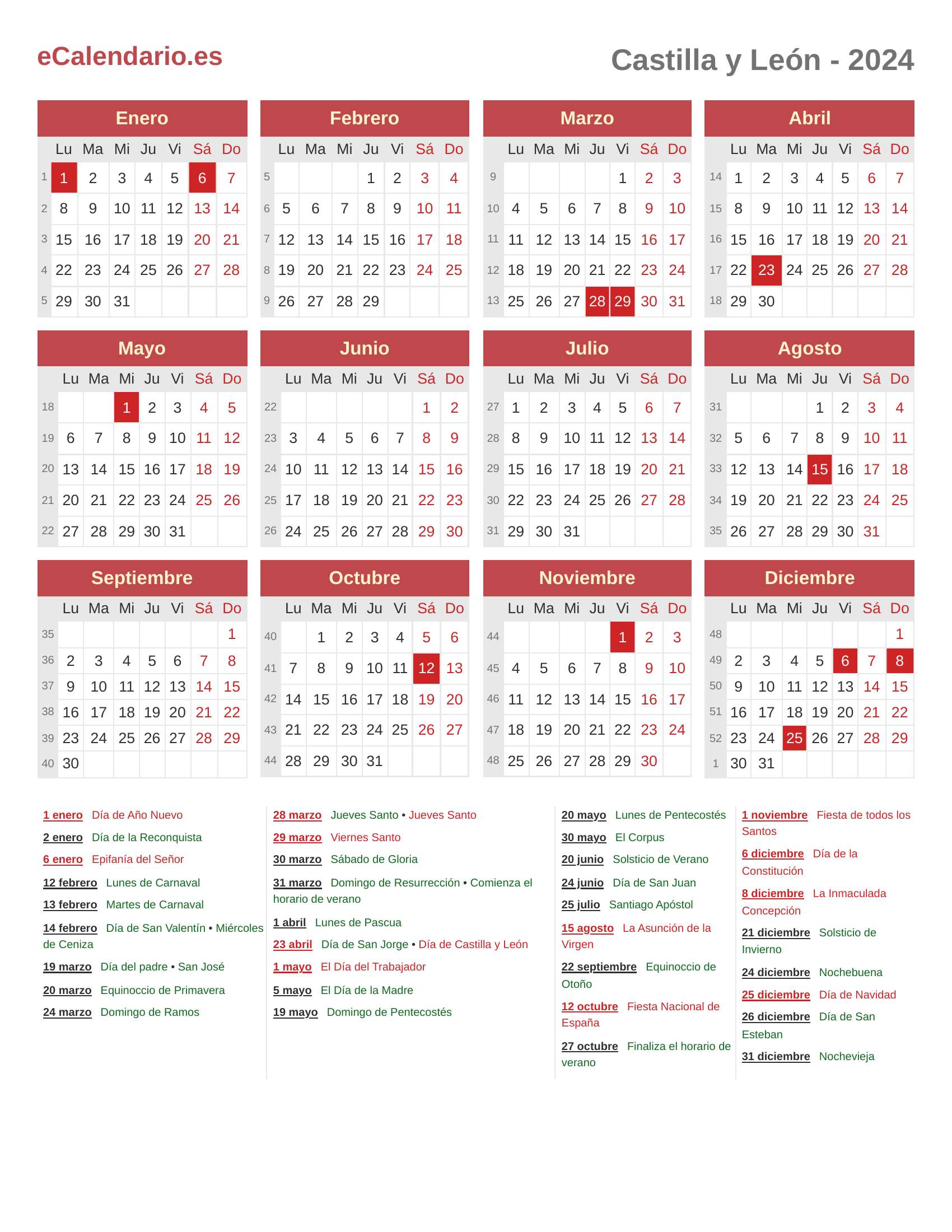 Calendario 2024 - Castilla y León