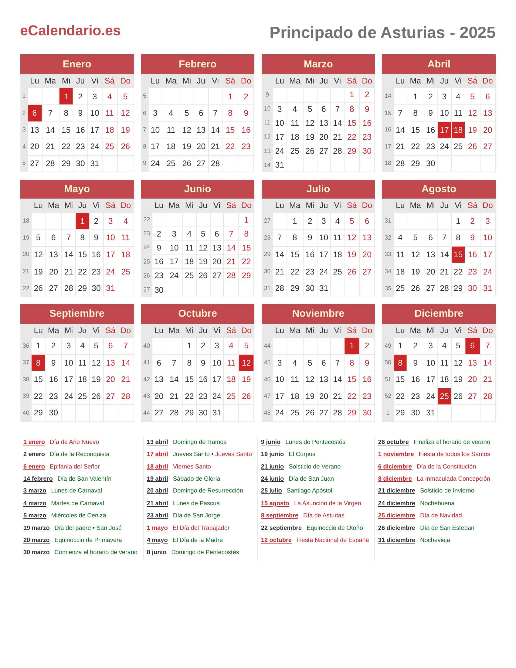 Calendario 2025 - Principado de Asturias