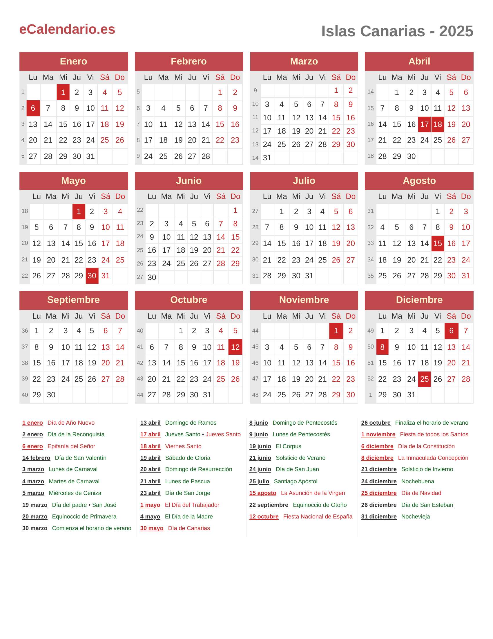 Calendario 2025 - Islas Canarias