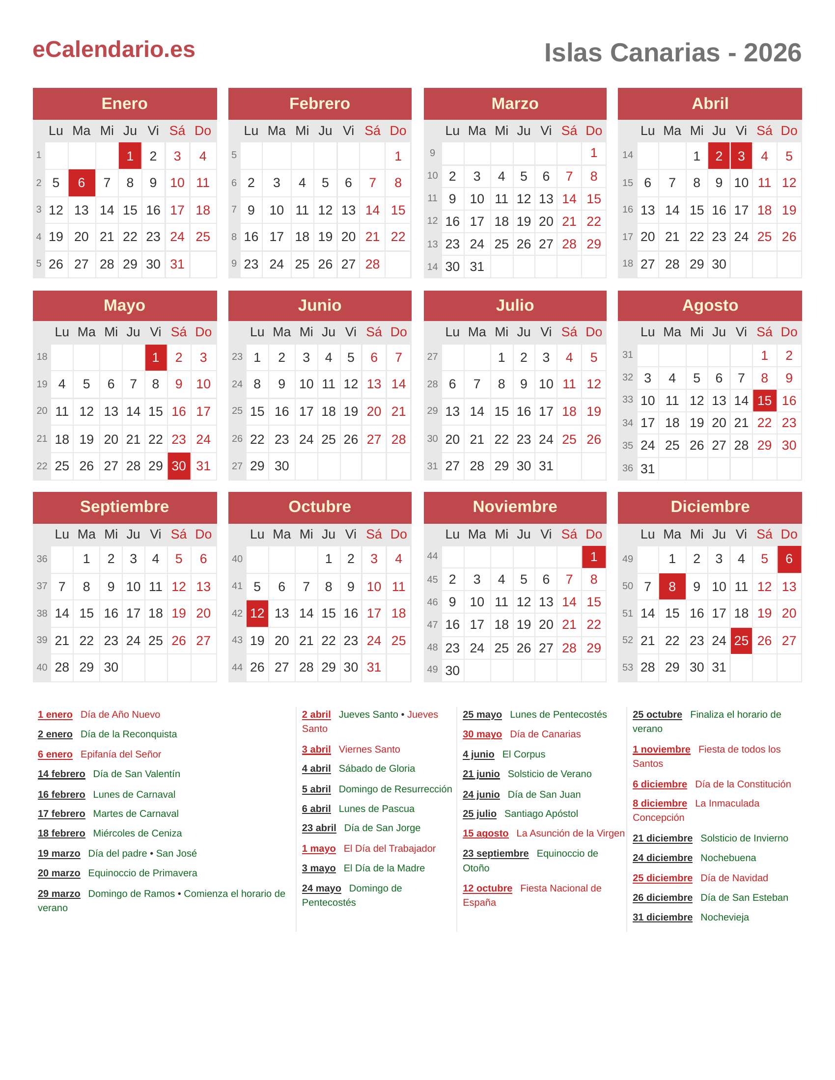Calendario 2026 - Islas Canarias
