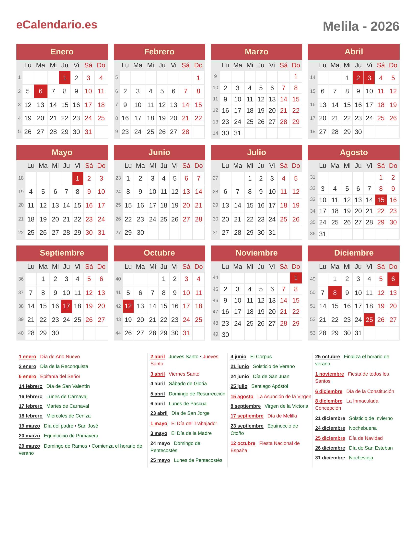 Calendario 2026 - Melila