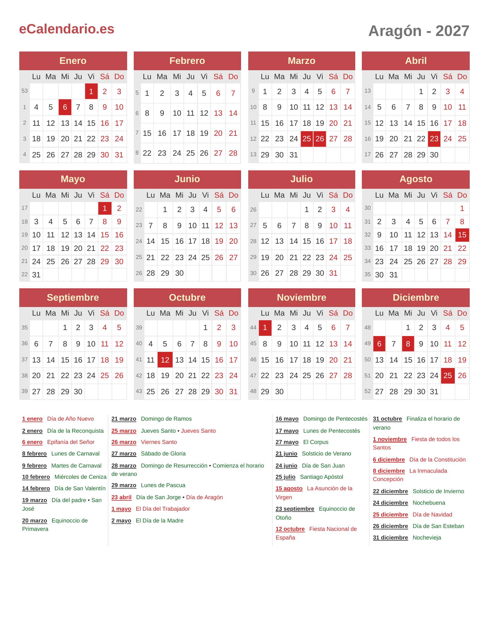 Calendario 2027 - Aragón