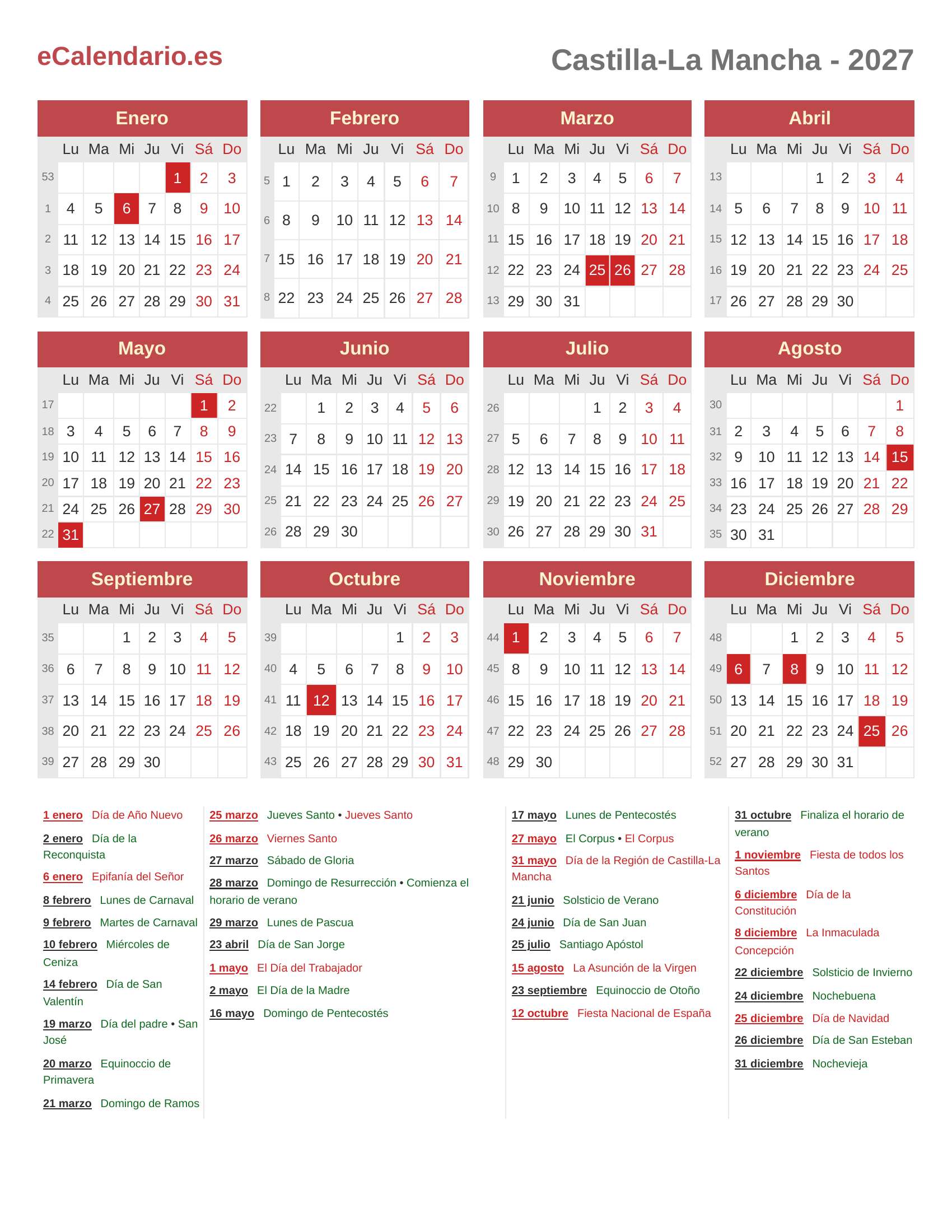 Calendario 2027 - Castilla-La Mancha