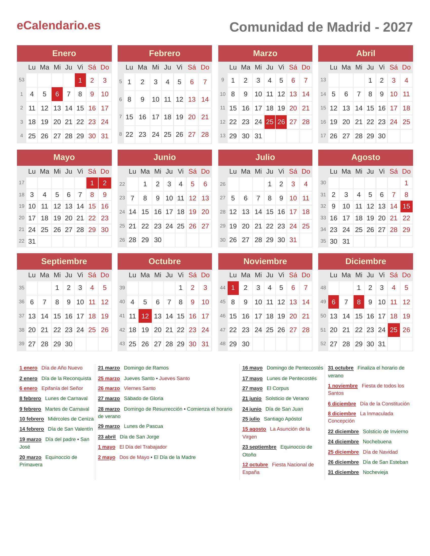 Calendario 2027 - Comunidad de Madrid