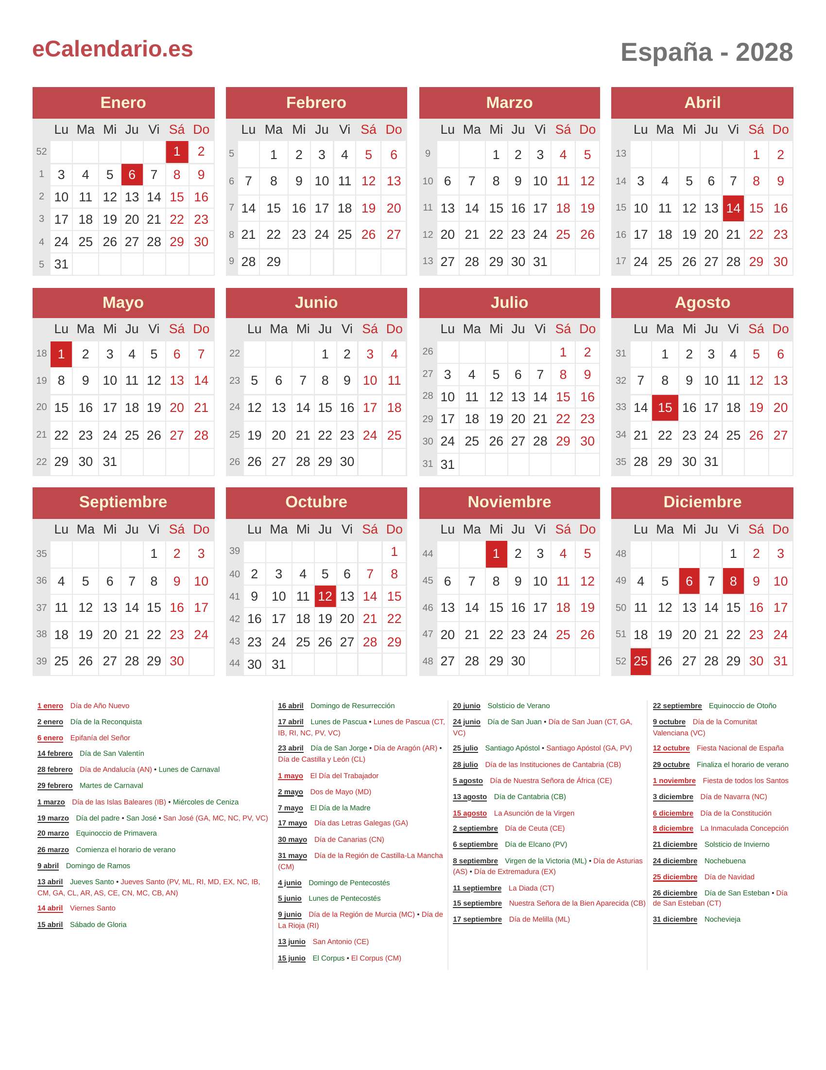 Calendario 2028 - España
