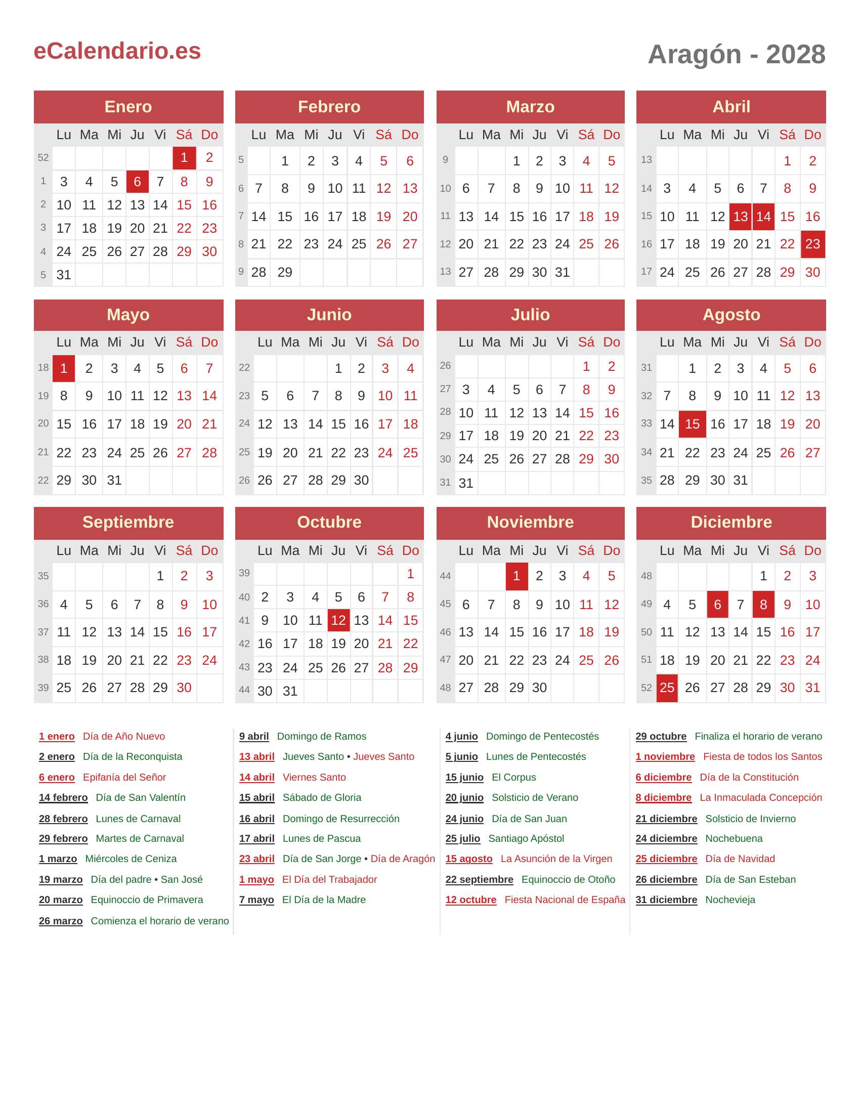 Calendario 2028 - Aragón