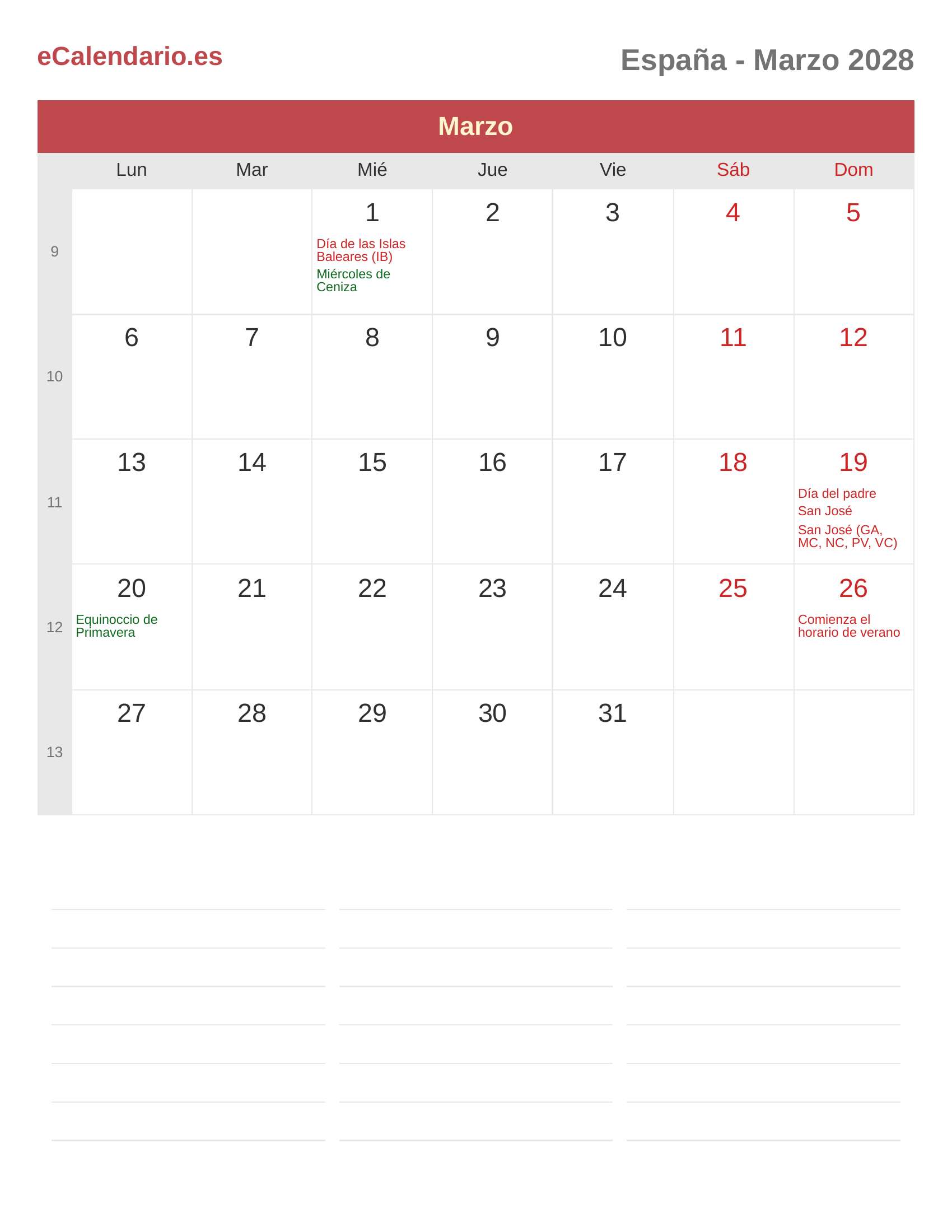 Calendario Marzo 2028 - España
