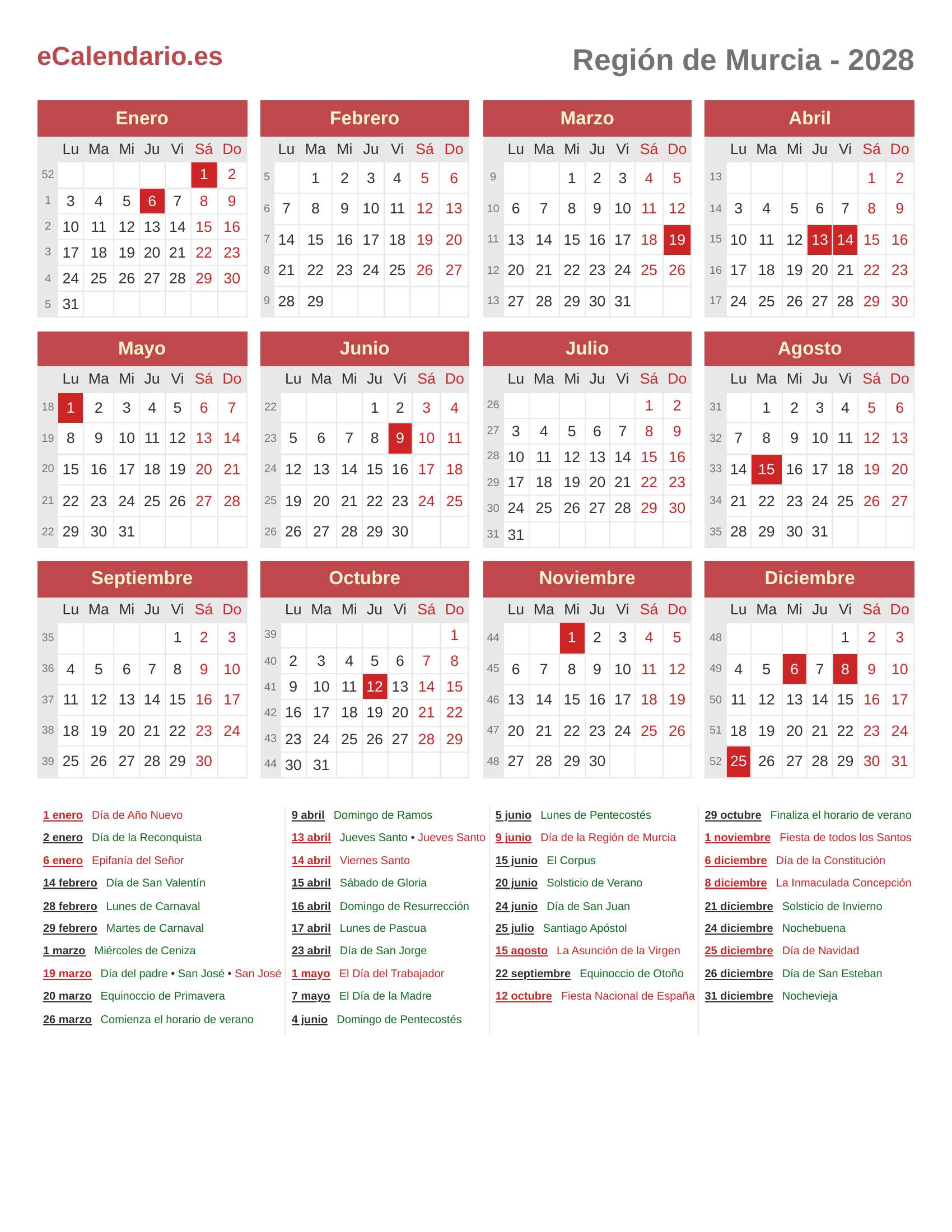 Calendario 2028 - Región de Murcia