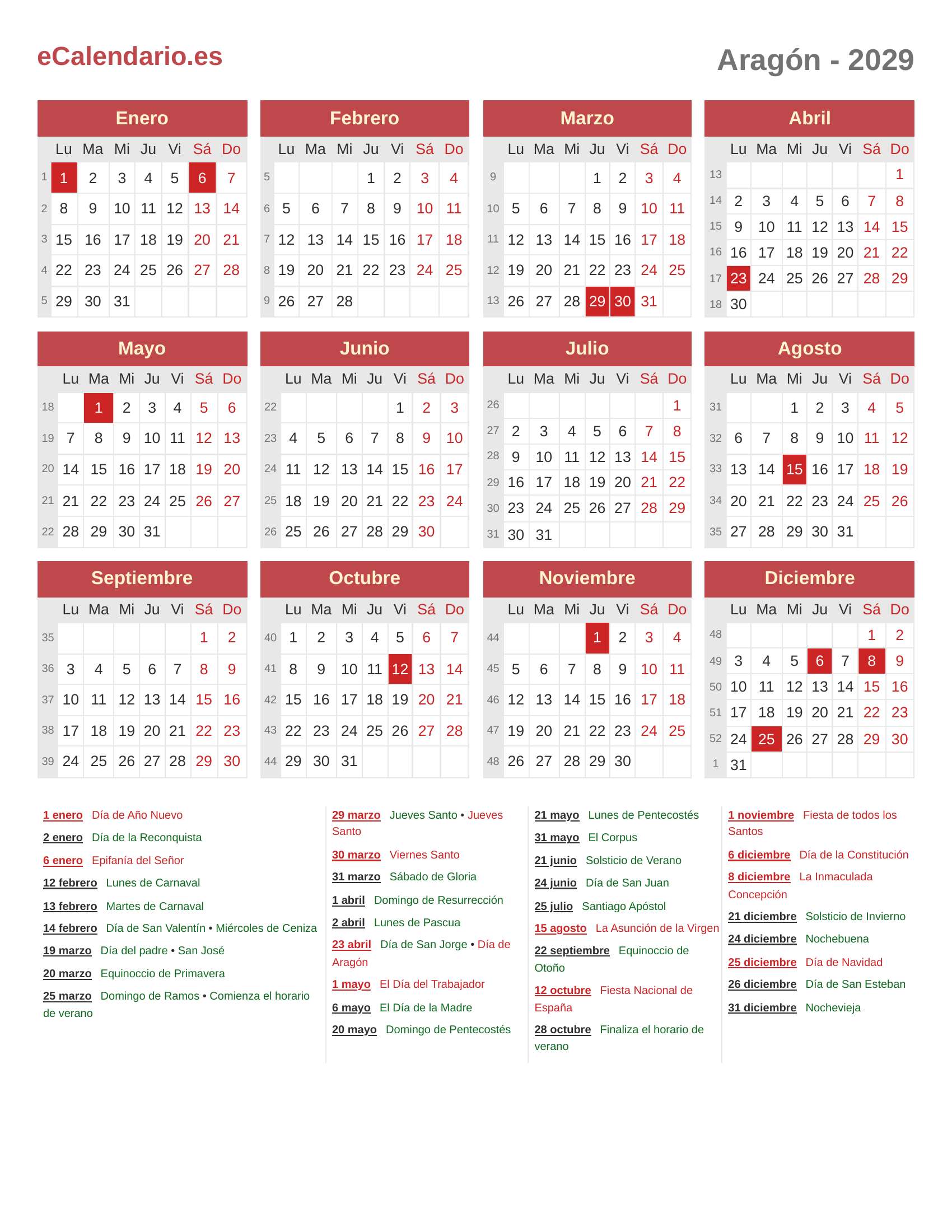 Calendario 2029 - Aragón