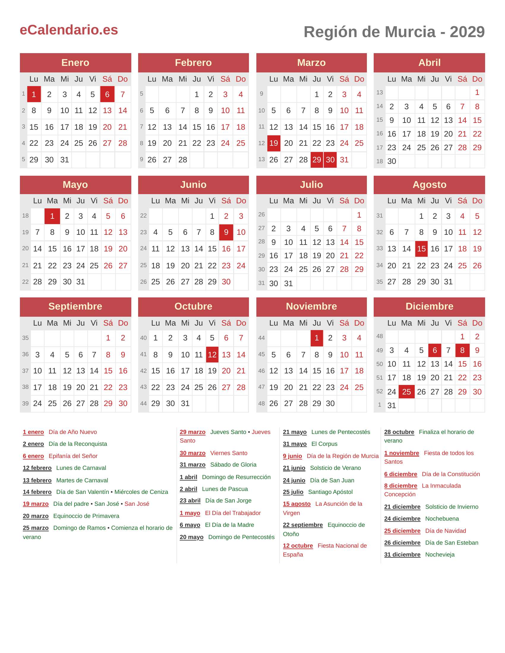 Calendario 2029 - Región de Murcia