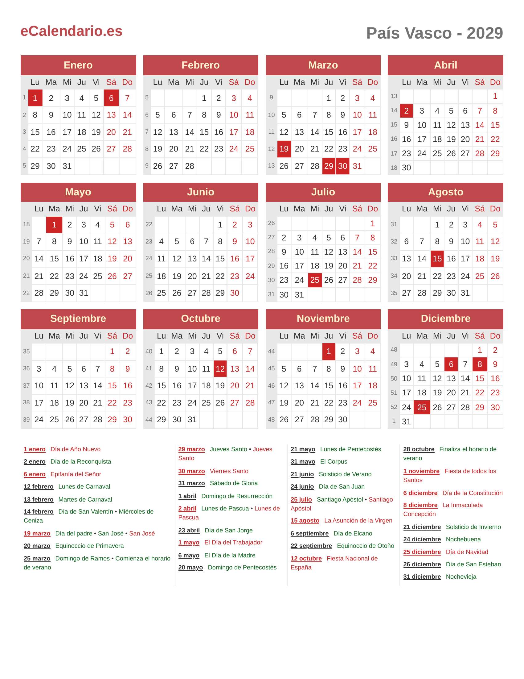 Calendario 2029 - País Vasco